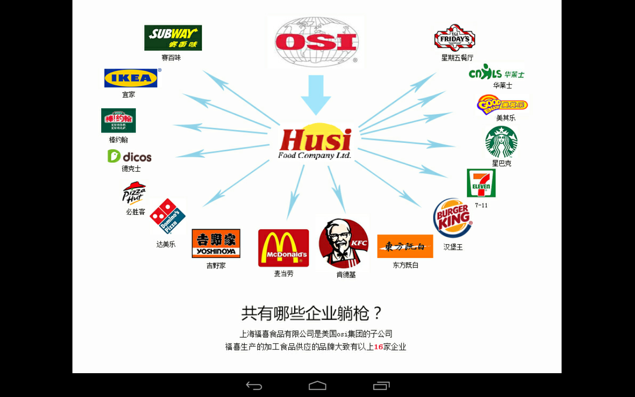 報道によれば上海福喜食品は製品を吉野家、スターバックス、バーガーキング、セブン・イレブン、またサンドイッチのサブウェイや家具店イケアにも供給していたとみられる。